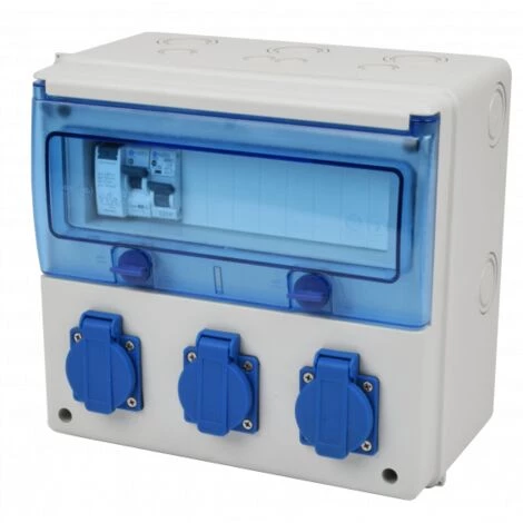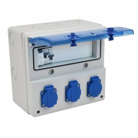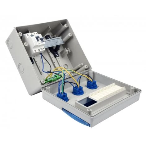 Composé d’un interrupteur différentiel (40A type AC), de 1 disjoncteur 16A, de 3 prises avec terre 16A IP54 avec fermeture à clapet et 1 bornier de terre inclus.