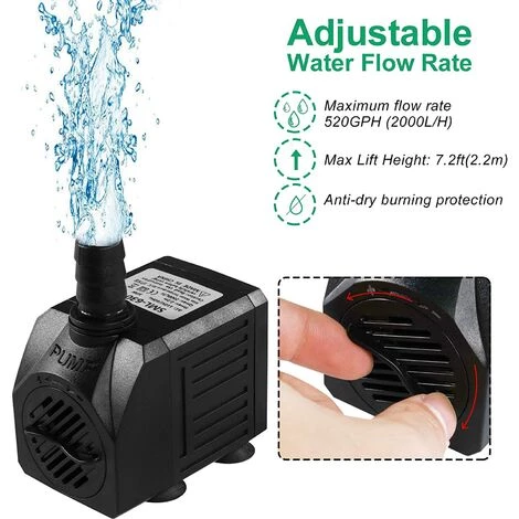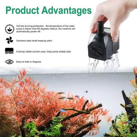 Cette pompe de fontaine à eau est submersible et doit être complètement plongée dans l’eau avant la mise sous tension pour éviter que la pompe à eau ne brûle.