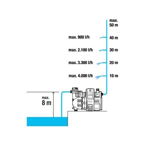 Un clapet anti-retour intégré assure une manipulation facile et un démarrage rapide. Le processus d’aspiration rapide garantit que l’eau soit pompée à une profondeur allant jusqu’à 8 m en quelques secondes seulement. Cette fonction est idéale pour les maisons et jardins de moyenne ou grande taille.