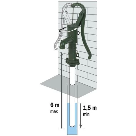 – Amorçage et fonctionnement par levier de pompage à bras, orientable à 180 . – Hauteur d’aspiration max. : 6 m à partir du nez de sortie de la pompe, avec un minimum d’immersion de 1,50 m du tube d’aspiration.