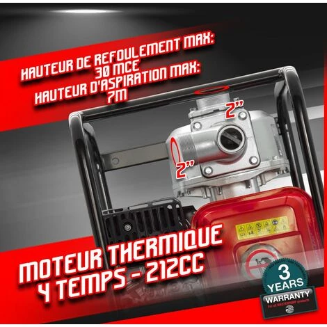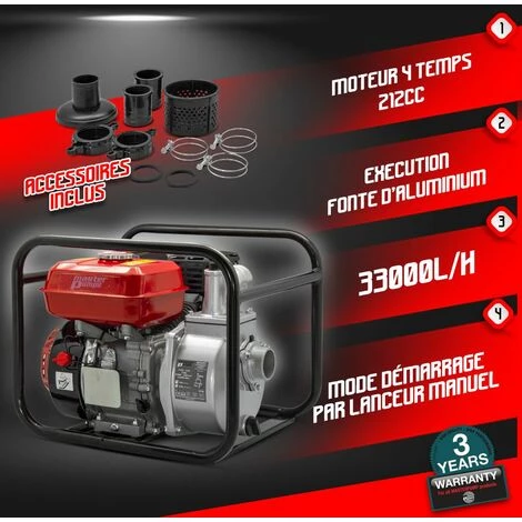 La motopompe à eau thermique MPG33HP7 offre un excellent rapport qualité/prix. Puissante et simple d’utilisation, elle est idéale pour l’arrosage des espaces verts, vider une piscine ou en cas d’inondation. Son moteur thermique 4 temps 212CC développe une puissance de 7 HP. Elle est alimentée par de l’essence sans plomb 95 et permet donc d’être utilisée sans la moindre source d’électricité.