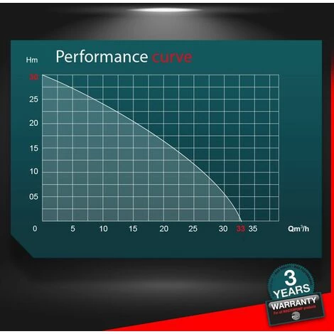 Cette pompe à eau peut fournir un débit d’eau maximal de 33 000 litres par heure. Sa puissance lui permet d’aspirer jusqu’à 7 mètres de profondeur et de refouler l’eau à une hauteur maximale de 30 mètres.