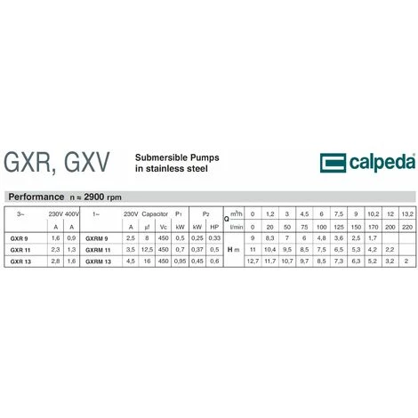 GXRM, GXVM: monophasé 230 V ??10% (220-240 V) avec interrupteur à flotteur et protection thermique.