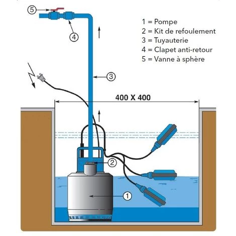 - Flotteur pour un fonctionnement automatique (Démarrage / arrêt) en fonction du niveau d’eau dans le regard / cuve