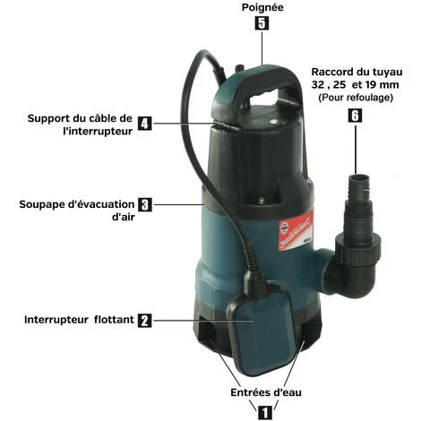 Cette pompe submersible est équipée d’un interrupteur flottant qui permet l’arrêt à distance de la pompe sans la débrancher (il faut attacher une corde au flotteur et en faisant bouger cette corde, on allume ou éteint la pompe submersible)