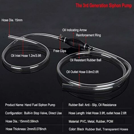 Largement utilisé: Parfait pour transférer en toute sécurité de l’essence, de l’essence, de l’essence, du diesel, de l’eau ou des liquides non corrosifs. Utilisé dans les navires, les véhicules, les tondeuses à gazon, les tracteurs, les motos, le lit à eau, l’aquarium et autres siphons liquides.