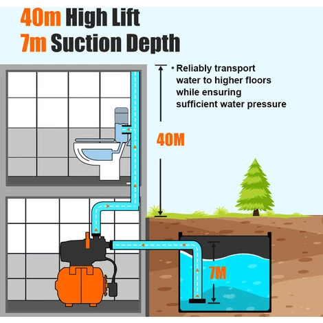 5. Pression constante pour une alimentation en eau toujours disponible. Un moteur électrique sans entretien et doux avec un interrupteur marche/arrêt pratique.