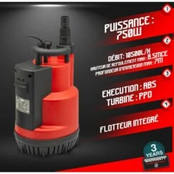 - Capacité de pompage allant jusqu’à 6000 litres d’eau propre par heure et est capable de traiter des particules de saleté de 1 mm maximum.