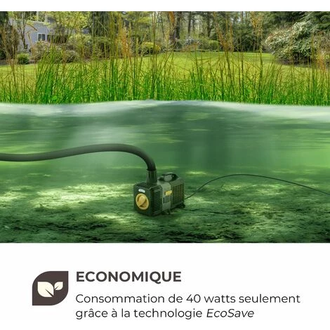 Avec la pompe de bassin Waldbeck Lagoon 5200, vous disposez d’une puissante pompe à eau aux utilisations variées. Grâce à la technologie EcoSave et à sa faible consommation de seulement 40 watts par heure, elle est l’outil idéal et économique pour faire circuler de l’eau en continu indispensable dans les cours d’eau et les étangs de pêche. Avec son débit pouvant atteindre 5200 litres par heure, elle pompe de grandes quantités d’eau et assure l’apport nécessaire en oxygène dans les étangs et ruisseaux. En outre, elle pompe avec l’eau les particules jusqu’à 6 mm et peut ainsi faire partie intégrante d’un système de filtration pour éliminer les impuretés des étangs pour le plaisir des carpes koï et des poissons rouges. Un panier-filtre empêche la pompe de ruisseau d’aspirer les feuilles, plantes aquatiques ou habitants du cours d’eau.